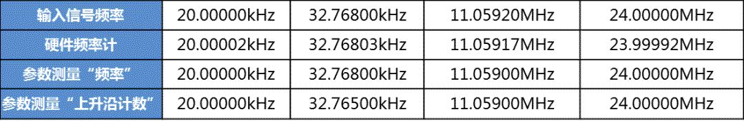 可見(jiàn)三者測(cè)量結(jié)果差異不大,硬件頻率計(jì)的分辨率更高,而參數(shù)測(cè)量中有效位數(shù)只有5位。此信號(hào)發(fā)生器輸出頻率的準(zhǔn)確度為±1ppm,示波器內(nèi)部晶振的頻率準(zhǔn)確度為±2ppm,在上述的24MHz硬件頻率計(jì)中,測(cè)量的準(zhǔn)確度為80Hz/24MHz=3.33ppm,基本在儀器的測(cè)量精度內(nèi)。參數(shù)測(cè)量值在某些情況下顯得更接近真實(shí)值,這是因?yàn)槠溆行粩?shù)不夠而四舍五入的原因,準(zhǔn)確度更高的還是硬件頻率計(jì)。