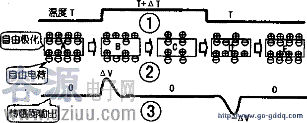 當溫度下降時,溫度又回到原來的狀態(T),其自由極化狀態如圖2D所示。由于溫度的下降變化件(相對而言)過程與溫度上升變化相反,所以,傳感器表而的電荷變化與上升時變化過程剛好相反,是個反過程。