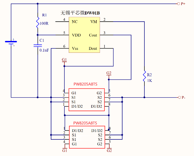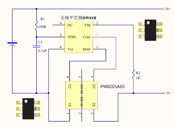 DW01B, 特點(diǎn):外置MOS(PW8205A6S或者PW8205A8TS),由于是外置MOS,過充電電流和過放電電流可通過 很 多 個(gè)MOS并聯(lián)來提高,這是很常見的,采用SOT23-6封裝。