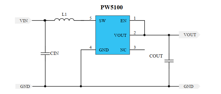 PW5100外圍簡潔,僅需要2個貼片電容,一個貼片電感(1uh-10uh)即可