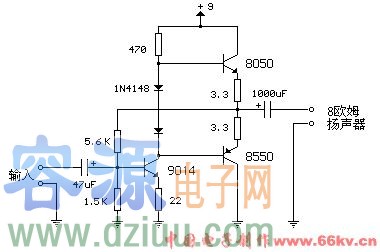 本電路是一個小的音頻放大器類似于一個小的晶體管收音機。輸入級可偏置電壓,使供應分在兩個互補輸出是略微偏導基地之間的二極管三極管平分。 3.3歐姆的電阻串聯使用,輸出晶體管的發射極穩定的偏置電流,因此不