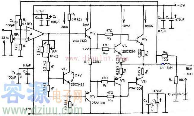 電路中運放的作用是電壓放大,晶體管VT1~VT7用于電流放大,VT1用來調整偏置電壓。 調試方法:本電路工作于AB類狀態,在靜態時調整RP1使VT4~VT7的靜態電流各為10MA即可。 :
