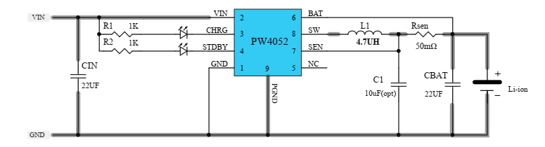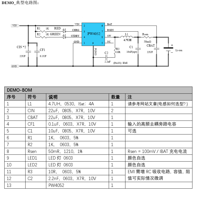 PW4052 是一顆適用于單節(jié)鋰電池的、具有恒壓/恒流充電模式的充電管理 IC。該芯片采用開關(guān)型的工作模式, 能夠為單節(jié)鋰電池提供快速、 高效且簡單的充電管理解決方案。