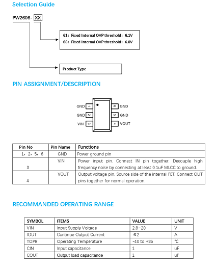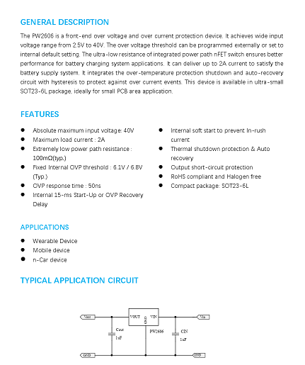 PW2606是一種前端過電壓和過電流保護裝置。它實現了廣泛的輸入電壓范圍從2.5V到40V。過電壓閾值可在外部編程或設置為內部默認設置。集成功率路徑nFET開關的超低電阻確保了更好的性能電池充電系統應用的性能。它可以提供高達2A的電流,以滿足電池供電系統。它集成了過熱保護停機和自動恢復功能具有滯后的電路,以防止過電流事件。這個設備有超小型的SOT23-6L封裝,適合小面積PCB應用。