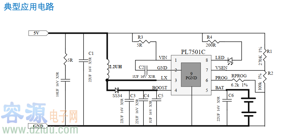 PL7501C 是一款 3.6V-5.5V 輸入, 1A 輸出,雙節鋰電池/鋰離子電池充電的異步升壓充電控制器。具有完善的充電保護功能。針對不同的應用場合,芯片可以通過方便地調節外部電阻的阻值來改變充電電流的大小。針對不同種類的適配器,芯片內置自適應電流調節環路,智能調節充電電流大小,從而防止充電電流過大而拉掛適配器的現象。該芯片將功率管內置從而實現較少的外圍器件并節約系統成本。