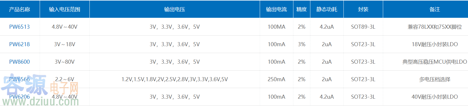 PW6566 系列是使用 CMOS 技術開發的低壓差,高精度 輸出電壓,低消耗電流正電壓型電壓穩壓器。由于內置有低通態電阻晶體管,因而壓差低。