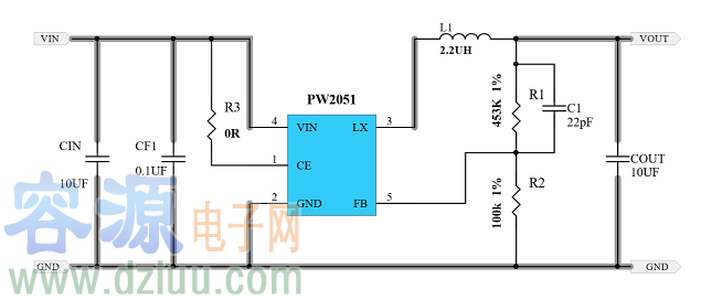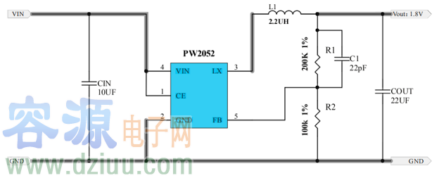 PW5100 的工作頻率高達 1.2MHz,其目的是為了能夠減小外部的電感尺寸和輸出電容容值,故 PW5100 只需要 1uH 以上的電感就可以保證正常工作,