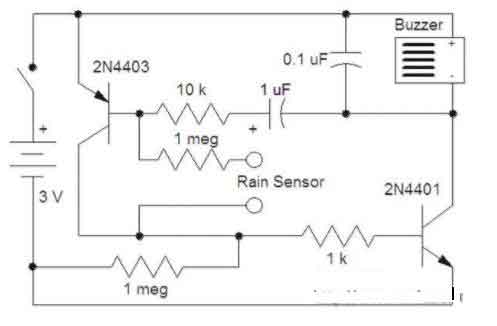 下雨(雨水)探測(cè)器電路原理如圖。這個(gè)電路使用了一個(gè)傳感器,傳感器是用一小塊敷銅板蝕刻而成,這個(gè)是一個(gè)簡(jiǎn)單可控硅電路用來(lái)檢測(cè)下雨,并發(fā)出蜂鳴聲。可控硅也可用來(lái)觸發(fā)一個(gè)繼電器,打開一盞燈,或者發(fā)送一個(gè)信號(hào)到安全系統(tǒng)。