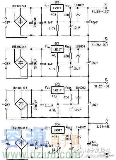 原理圖見圖4。電路由四塊LM317組成,四組輸出電勢只通過R2進行調(diào)節(jié)。調(diào)節(jié)R2,IC4的輸出電勢在1.25-30V之間連續(xù)可變,同時,與之串聯(lián)的IC1-IC3的輸出電勢也隨之改變,從而得到1.25-120V間的四組直流穩(wěn)定電壓。