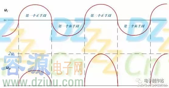 由波形圖可知,輸出電壓uo是輸入電壓ui的2倍,基于同樣的原理,也可以擴展更高倍數的倍壓電路,這樣可以從低電壓獲取高電壓,但是倍壓整流電路輸出的電流小,不適合輸出聯(lián)接重負載的情況(也就是大電流輸出的場合)