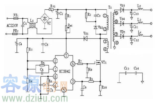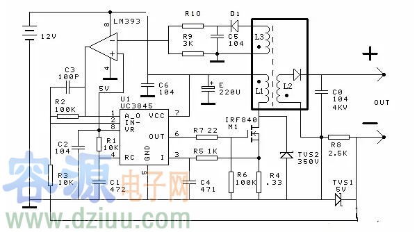 研制儀器需要一個(gè)能在0到3兆歐姆電阻上產(chǎn)生1MA電流的恒流源,用UC3845結(jié)合12V蓄電池設(shè)計(jì)了一個(gè),變壓器采用彩色電視機(jī)高壓包,其中L1用漆包線在原高壓包磁心上繞24匝,L3借助原來高壓包的一個(gè)線圈,L2借助高壓包的高壓部分。L3和LM393構(gòu)成限壓電路,限制輸出電壓過高,調(diào)節(jié)R10 可以調(diào)節(jié)開路輸出電壓。
