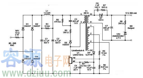 D5、R2、R3和C3組成RCD-R箝位電路,用于限制漏感引起的漏極電壓尖峰。電阻R3擁有相對(duì)較大的值,用于避免漏感引起的漏極電壓波形振蕩,這樣可以防止關(guān)斷期間的過度振蕩,從而降低傳導(dǎo)EMI。