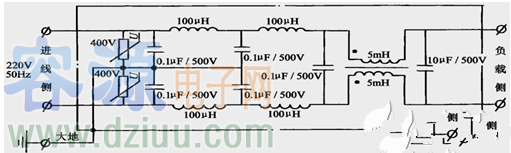 圖中的100H電感、0.1F電容組成高頻濾波器,用于吸收從電源線傳導進來的中短波段的高頻噪聲干擾;圖中兩只對稱的5mH電感是由繞在同一只鐵心兩側、匝數相等的電感繞組構成的,稱為共模電感,用于吸收因電源波形畸變而產生的諧波干擾;圖中的壓敏電阻用于吸收因雷擊等引起的浪涌電壓干擾。 交流電源濾波器的內部電路。容-源-電-子-網-為你提供技術支持