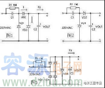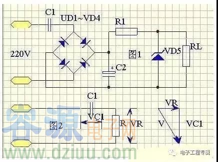 如圖-1,C1 為降壓電容器,D2 為半波整流二極管,D1 在市電的負半周時給C1 提供放電