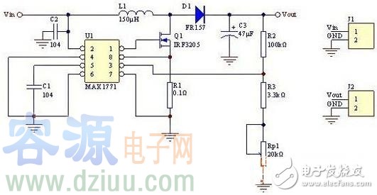 MAX1771是美信公司的電源管理芯片,可以做為升壓電路使用,電路結構為Boost電路,如下圖2.1所示。當電壓輸入電壓的范圍是5-12V,輸出根據的調節范圍是24-36V。引腳1輸出PWM來控制場效應管IRF3205的導通與截止。引腳3是電壓反饋端,內置1.25V的穩壓源。當輸入到3腳的電壓高于或低于1.25V時,芯片會自動調節PWM占空比的減小或增大,以得到穩定的輸出。