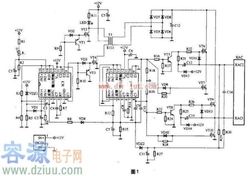 圖1電路中,由芯片IC1及其外圍電路、三極管VT1、VT3、MOS功率管VT2、VT4以及變壓器T1組成12V直流變換