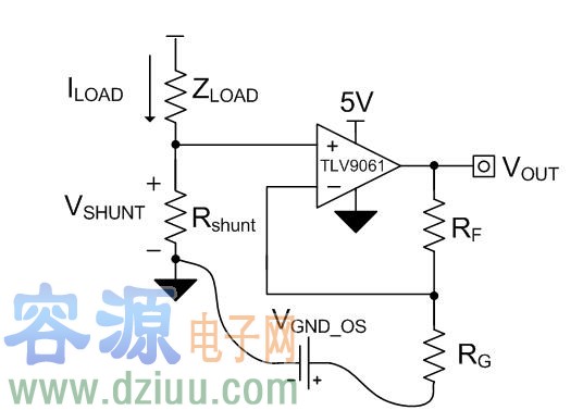 第二個設計要求是要將電阻RG的接地端盡可能地靠近分流電阻(Rshunt)的接地端。當電流流過印刷電路板的接地層時,接地層上會產生壓降,致使印刷電路板上不同位置的接地層電壓出現差異。這會使系統出現偏移電壓。在圖3中,連接到RG的地面電壓源符號代表了地電位的不同。