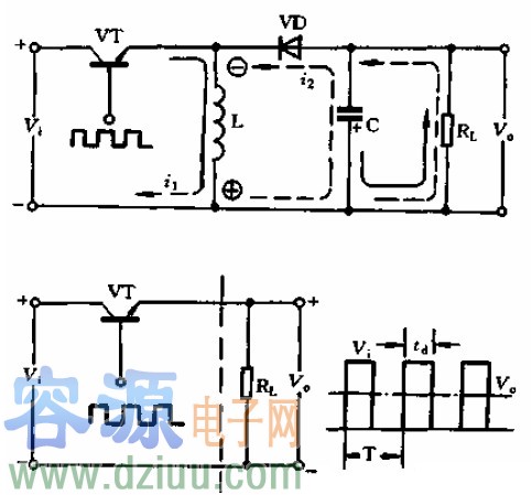 下圖中所采用電感L、電容C和負載RL并聯的工作方式。當開關管VT導通時,二極管Ⅷ反偏截止,輸入電壓vi只對電感L儲能。這時負載RL上的電流是由前幾個周期已充了電的電容C放電供給,電流方向如圖中實線。在開關管VT截止時,電感L上自感電動勢的極性是上負下正,電感把儲存的磁能釋放出來f通過二極管向電容C補充能量,同時向負載RL供電,電流方向如圖中虛線所示。這三個元器件的作用和串聯型開關電源中的作用相同。
