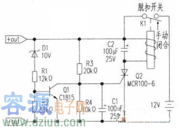 蓄電池過放電會造成極板酸化,影響蓄電池的正常使用壽命。為解決該問題,本文特意設計了一款微功耗蓄電池過放電保護電路,如下圖所示,該電路具有極低的檢測電流(檢測電流≤l.lmA)、保護電路動作后不再消耗電能、抗干擾能力強等優點。當手動閉合脫扣開關Kl后,電路得電進入工作狀態。首先因C1兩端的電壓不能突變,保持0V附近,02截止,當蓄電池電壓>10.7V,穩壓管D1導通,al飽和導通,Q2控制極因得不到觸發電壓而截止,K1不動作,蓄電池和后級電路處于閉合工作狀態,當蓄電池電壓<10.7V時,穩壓管D1截止,Ql轉為截止,電阻R3給電容C1充電。當C1兩端電壓達到0.6V左右時,可控硅Q2被觸發導通,脫扣開關動作,斷開后級負載電路。