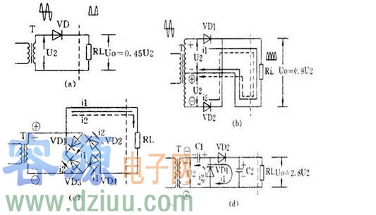 用多個二極管和 電容器可以獲得較高的直流電壓。上圖(d)是一個二倍壓整流電路。當 U2 為負半周時 VD1 導通, C1 被充電, C1 上最高電壓可接近 1.4U2 ;當 U2 正半周時 VD2 導通, C1 上的電壓和 U2 疊加在一起對 C2 充電,使 C2 上電壓接近 2.8U2 ,是 C1 上電壓的 2 倍,所以叫倍壓整流電路。容-源-電-子-網-為你提供技術支持