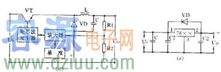 上圖(e)是一個三端穩壓器電路。圖中 C 是主濾波電容, C1 、 C2 是消除寄生振蕩的電容 ,VD 是為防止輸入短路燒壞集成塊而使用的保護二極管。