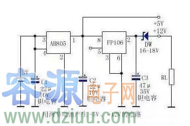 兩節(jié)1.5V堿性電池輸出的3V電壓輸入AH805,AH805輸出+5V電壓,其一路作5V輸出,另一路輸入FP106使其產(chǎn)生28~30V電壓,經(jīng)穩(wěn)壓管穩(wěn)壓后輸出+12V電壓。