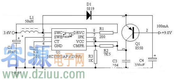 2、用MC34063做3.6V電轉(zhuǎn)9V電路圖