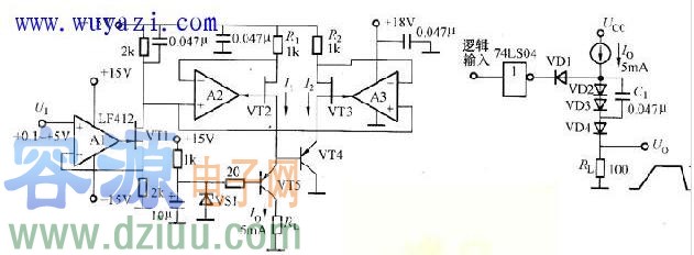 圖(b)所示為精準恒流電源的應用實例,它是將這種恒流電路與開關電路組合成高精度脈沖發生電路。VD2和V D3構成電平移動電路,VD1和VD4是采用肖特基二極管構成的開關電路。多個這種電路的組合可構成高精度D/A轉換器。