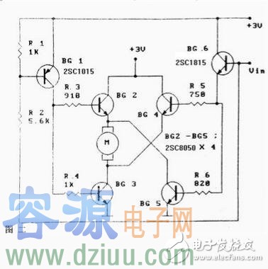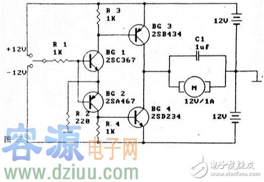 圖1電路利用了達林頓《m.zskn.com.cn》晶體管擴大電機驅動電流,圖示電路將BG1的5A擴流到達林頓《m.zskn.com.cn》復合管的30A,輸入端可用低功率邏輯電平控制。上述電路采用的驅動方式屬傳統的單臂驅動,它只能使電機單向運轉,雙臂橋式推挽驅動可使控制更為靈活。