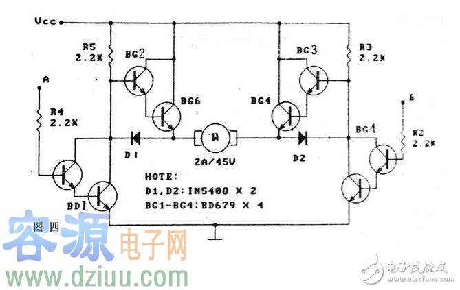 圖4電路以達林頓《m.zskn.com.cn》管為基礎驅動電機的正反轉,它由完全對稱的兩部分組成。當A、B兩輸入端之一為髙電平,另一端為低電平時,電機正轉或反轉;當兩輸入端同為高或低電平時,電機停轉;如采用脈寬調制,則可控制電機的轉速,因此圖4具有四種組合輸入狀態,電機卻可以產生五種運行狀態。這里箝位二極管D1、D2的加入具有重要的作用,它使達林頓《m.zskn.com.cn》管BG2,BG3不會產生失控,這在大功率下運轉時更顯安全。本電路的另一特點是輸入控制邏輯電平的高低與電機的直流工 作電壓無關,用TTL標準電平就能可靠地控制。