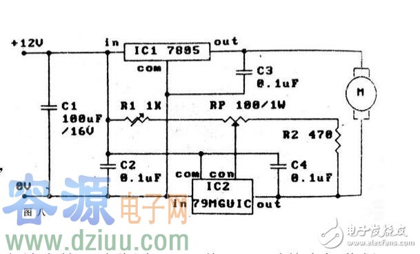 用集成電路驅動電機的情況也較多,和一般的三端穩壓器直接驅動不同,圖8電路使電機可以獲得從0V至7V的驅動電壓,因而具有低壓調速性能,IC1為 正輸出的固定穩壓器,IC2為可調負輸出的四端穩壓器,調節R1可以使電機獲得零電壓,由于IC2的散熱片內部與輸入端相連,因此IC1, IC2可用公共散熱器,以適應低壓工作。