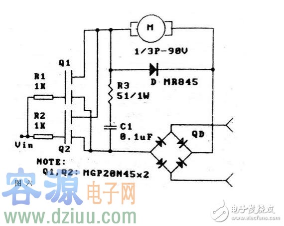因電機對供電穩定的要求并不高,圖6的驅動電路不失為一種交流供電方案,交流電經全橋整流后,驅動并聯使用的MOS場效應管Q1、Q2,R3、C1起濾波作用;續流二極管D用以防止高電壓對Q1、Q2的破壞。
