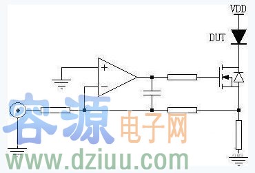 運(yùn)放組成基本的反向運(yùn)算電路,驅(qū)動vdmos管的柵極,漏源電流通過vdmos管源極取樣電阻,加到運(yùn)放反向輸入端,與輸入波形相加形成反饋,運(yùn)放輸出電壓控制vdmos管的柵極電壓vgs,進(jìn)而控制漏極輸出電流ids[3]。這個(gè)ids就是施加給待測二極管(dut)的正向浪涌電流。
