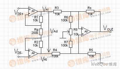 傳感器轉(zhuǎn)換放大測試電路 由運(yùn)算放大器A1和A2構(gòu)成第Ⅰ級,由運(yùn)放A3構(gòu)成第Ⅱ級。各運(yùn)放一般是高性能放大器,例如低漂移高精度運(yùn)算放大器OP—07。把被放大信號的兩端Vin+和Vin-分別接到A1和
