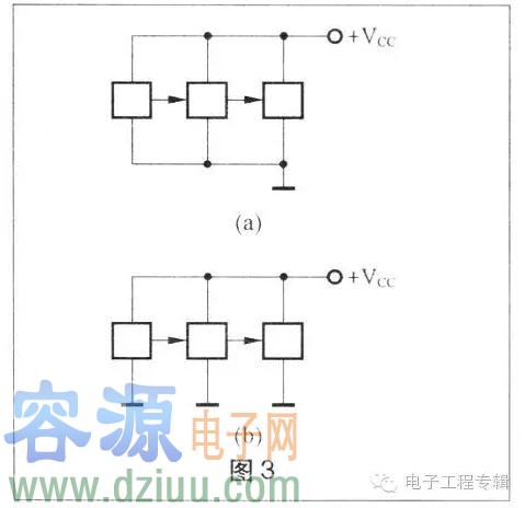 電路圖中通常將電源引線安排在元器件的上方,將地線安排在元器件的下方,如圖3(a)所示。有的電路圖中不將所有地線連在一起,而代之以一個個孤立的接地符號,如圖3(b)所示,應理解為所有地線符號是連接在一起的。
