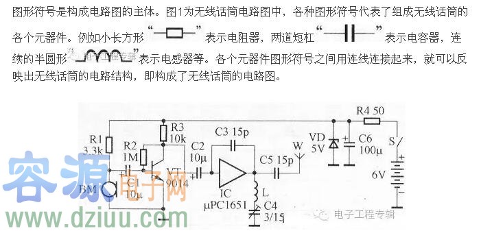 構成的,這些要素主要包括圖形符號、文字符號、連線以及注釋性字符等。下面我們通過圖1所示無線話筒電路圖的例子,作進一步的說明。