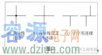 元器件之間的連接導線在電路圖中用實線表示。導線的連接與交叉如圖2所示,圖2(a)橫豎兩導線交點處畫有一圓點,表示兩導線連接在一起。圖2(b)兩導線交點處無圓點,表示兩導線交叉而不連接。導線的丁字形連接如圖2(c)所示。