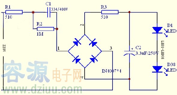 今天為大家?guī)砹艘豢罡吡炼扔止?jié)能的LED燈杯電路圖,使用LED節(jié)能燈,不但節(jié)能,還具有壽命長(zhǎng)的優(yōu)點(diǎn)。如下圖所示,該燈使用220V電源供電,220V交流電經(jīng)C1降壓電容降壓后經(jīng)全橋整流再通過C2濾波后經(jīng)限流電阻R3給串