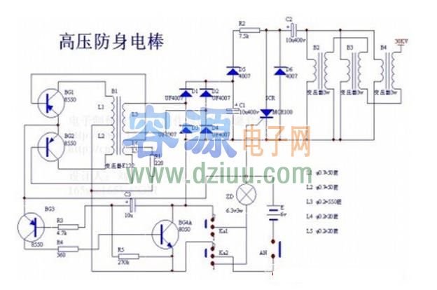 高壓防身電棒電路原理:BG1、BG2、B1構成交、直流變換