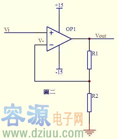 由abc式得Vout=Vi*(R1+R2)/R2 這就是傳說(shuō)中的同向放大器的公式了。