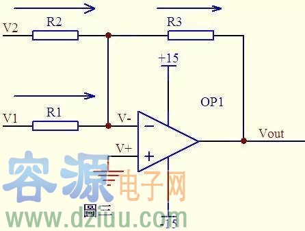 代入a式,b式變?yōu)閂1/R1 + V2/R2 = Vout/R3 如果取R1=R2=R3,則上式變?yōu)?Vout=V1+V2,這就是傳說(shuō)中的加法器了。