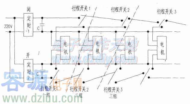 此裝置的電路如附圖所示。 一、工作原理 1.當定時器1定時開啟,電機開啟、窗簾關(guān)閉、窗簾到頭,行程開關(guān)1常閉點斷開,而常開點關(guān)閉,下一組窗簾盒開始關(guān)閉,如此可