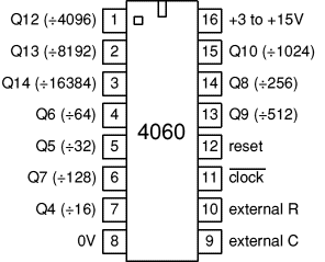 這是CMOS CD4060的電子計時器,它是CMOS 14級紋波傳送二進制計數(shù)器/分頻器和振蕩器。輸出QN是計數(shù)器的第n級,代表2 Ñ,例如Q4是2 4 = 16(1 / 16的時鐘頻率)和Q14是
