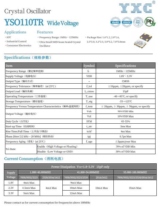 YXC晶振YSO110TR系列,頻率為25MHz,總頻差±20PPM,以下為YSO110TR系列規格書。