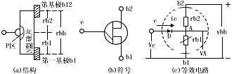 式中:rb1----第一基極與發射結之間的電阻,其數值隨發射極電流ie而變化,rb2為第二基極與發射結之間的電阻,其數值與ie無關;發射結是PN結,與二極管等效。