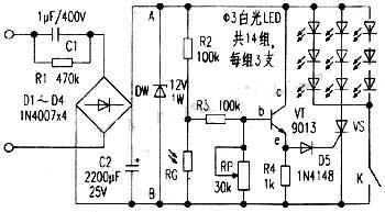 光控LED照明燈電路簡單,元器件少,用42支高亮白光發光二極管,把每3支串聯,然后在串聯在電路中,如圖