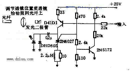 本電路使用中心頻率為50kHz的脈沖速率調制系統。饋給發射機的音頻改變著脈沖速率,用以驅動耦合到光纖的發光二極管(LED)。LED采用通用電氣公司的LED55C或類似的LED。位于光纖另一端的光敏晶體管接收并且解調光信號,使音頻信號復原。 本文由m.zskn.com.cn整理提供,部分內容來源于網絡,如有侵犯到你的權利請與我們聯系更正。