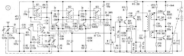 的連接關(guān)系來找.從左向右看過去,此電路的有源器件為BG1(變頻管)、BG2與BG3(中放管)、BG4與BG5(低放管)、BG6與BG7(功放管),