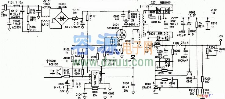 該機(jī)穩(wěn)壓控制電路主要由U101、光電耦合器PC201、精密穩(wěn)壓器件U201(KIA431)及取樣電阻R205、R211、R214、R210等組成。當(dāng)開(kāi)關(guān)變壓器次級(jí)+12V或+5V輸出電壓升高時(shí),經(jīng)取樣電阻分壓加至U201之R端電位升高,L5201之K端電壓則降低,使流經(jīng)光電耦合器PC201內(nèi)部光敏二極管之電流增大,其發(fā)光管亮度增強(qiáng),光敏三極管導(dǎo)通程度增強(qiáng),最終使流入U(xiǎn)101之②腳電流