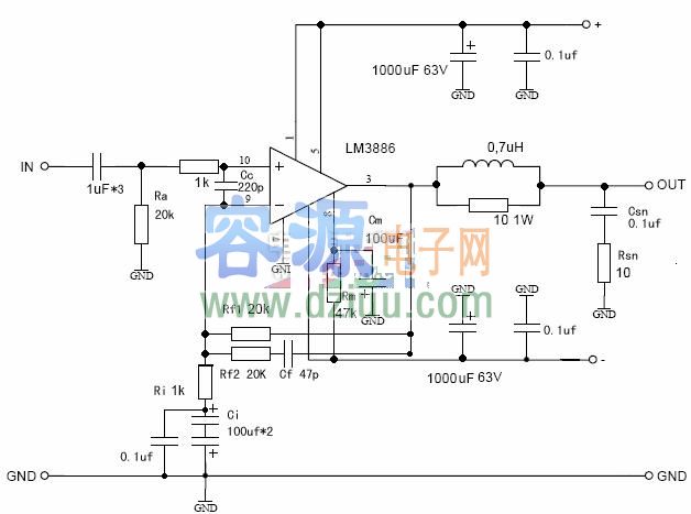 LM3886功率放大電路圖 <<版權(quán)聲明:本文由容源電子網(wǎng)(www_dziuu_com)整理提供,部分內(nèi)容來(lái)源于網(wǎng)絡(luò),如有侵犯到你的權(quán)利請(qǐng)與我們聯(lián)系更正。》